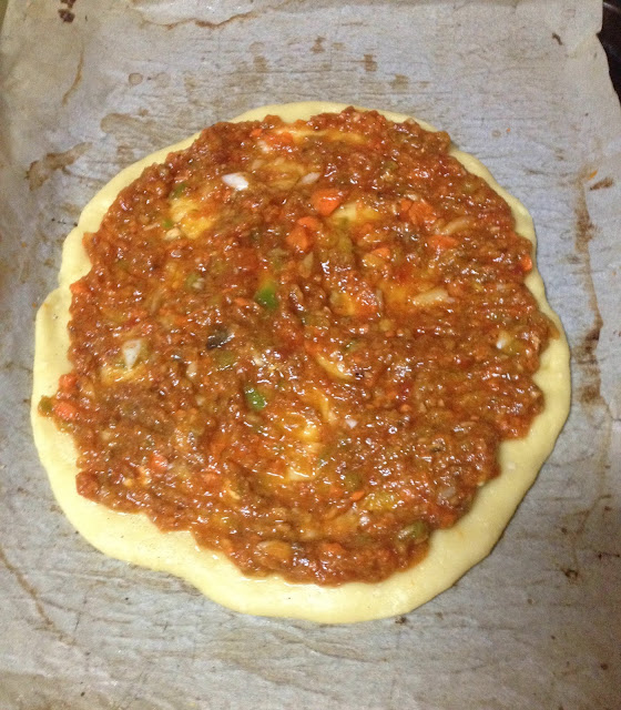 Mezclamos el agua, la manteca, el aceite de Oliva y la levadura, mezclamos bien y añadimos la sal , el azúcar y por ultimo la harina. Trabajamos la masa sobre una superficie de trabajo y le damos forma, tapamos con un paño y dejamos levar 30 minutos.
