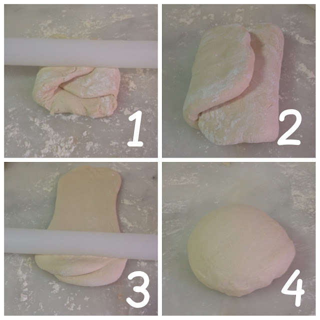 2º.-Ponemos un poco de harina en la mesa de trabajo y volcamos la masa, le hacemos un pliegue y le pasamos el rodillo, hacemos otro pliegue y le pasamos el rodillo y así hasta 10 veces. Le damos forma de bola y ponemos en el cuenco otra vez. Dejamos reposar otra hora.